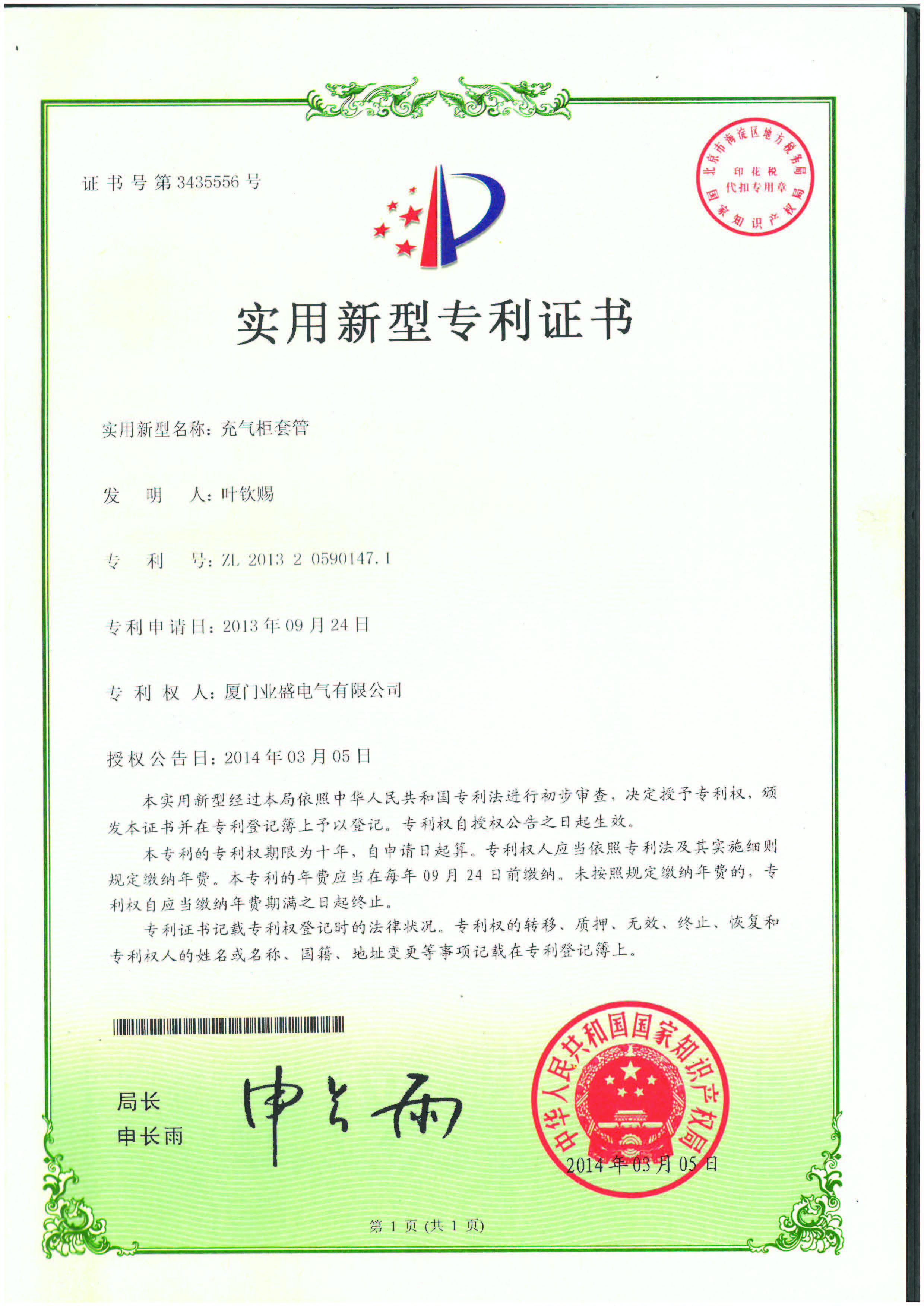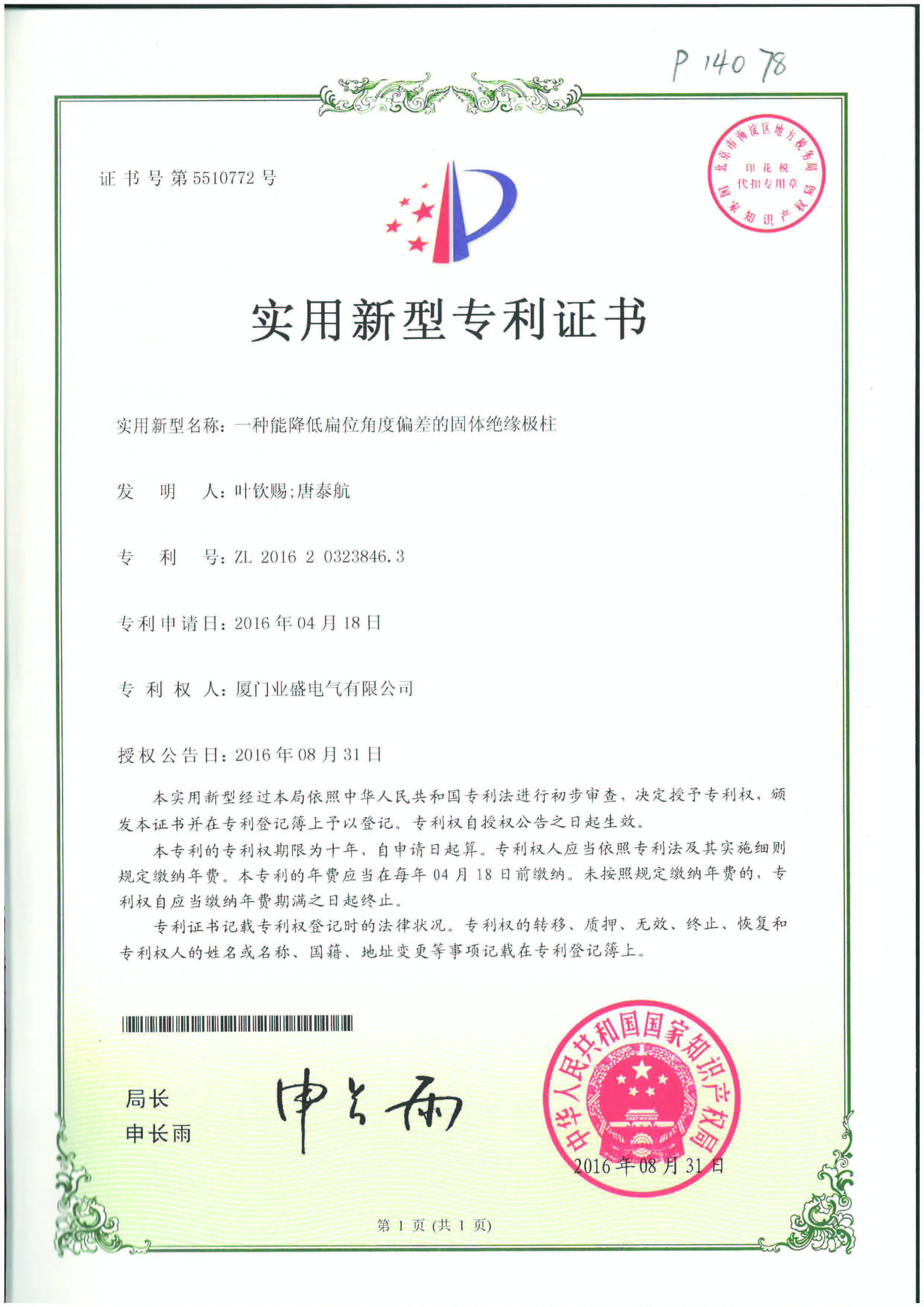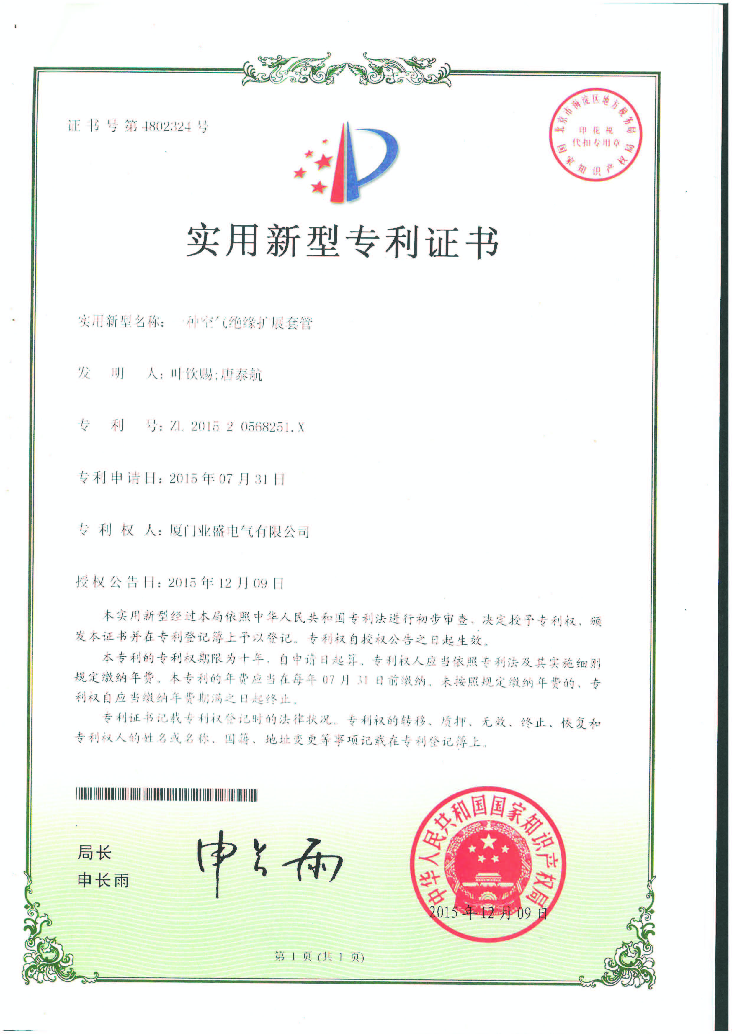 實(shí)用新型專(zhuān)利證書(shū)